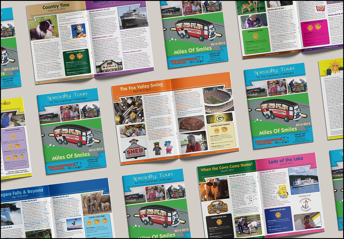 Progressive Travel, a bus company, set up specialty tours for the cognitively challenged. Catalogs were a good way for them to get tour information out to the public. They wanted the catalog to be fun, colorful, engaging, and have all the tour information on one or two pages.
