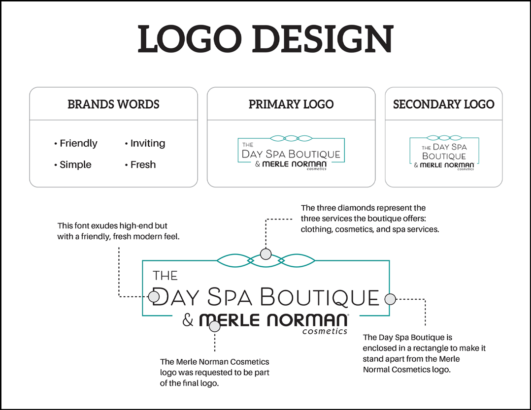 The three diamonds at the top of the logo represent the three services the boutique offers: clothing, cosmetics, and spa services. The font I used makes the logo feel expensive and modern. I enclosed most of the words within a rectangle to make that text stand out. I did not create the Merle Norman Cosmetics logo.